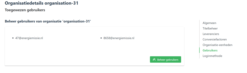 - Klik in het menu aan de rechterzijde op het kopje ‘Gebruikers’. Je beland op een overzicht van alle gebruikers die aan de organisatie zijn gekoppeld.