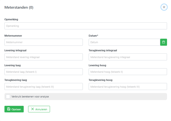- Zodra de gegevens zijn ingevuld druk je op 'Opslaan'. De verbruiken zullen vervolgens zichtbaar worden bij alle analyse- en dashboardfunctionaliteiten. Het berekenen van de verbruiken duurt ongeveer 5 minuten.