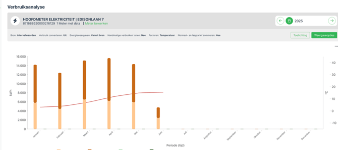 Met de functie 'Verbruiksanalyse' kun je eenvoudig het energieverbruik van een meter bekijken en analyseren. Volg onderstaande stappen om inzicht te krijgen in het verbruik over verschillende perioden. Hieronder volgt eerst een stappenplan om op het niveau van een enkele meter het verbruik te analyseren.